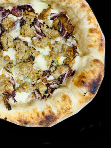 イタリアの冬の味覚、ラディッキオ(トレヴィス)とサルシッチャ(イタリアンソーセージ)を贅沢に使用した特別なピッツァです。ほろ苦いトレヴィスの風味と、ジューシーな豚ひき肉、濃厚なゴルゴンゾーラが絶妙に融合し、大人向けのリッチな味わいをお楽しみいただけます。