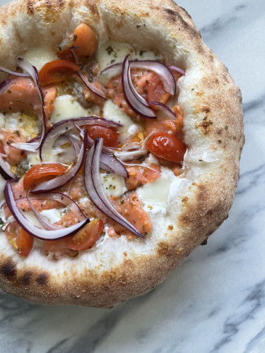 身が引き締まりあっさりした味わいのサーモンを丁寧にスモークし、サーモンとの相性が良いヨーグルトとケッパーの爽やかな酸味、新玉ねぎのシャキシャキした食感がアクセントとなる、贅沢な一枚です。