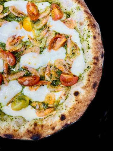 白エビ、イタリア産バジリコペースト、ニンニク、松の実、トマト、モッツァレラ、ペコリーノロマーノ、グラナパダーノ、オリーブオイル、